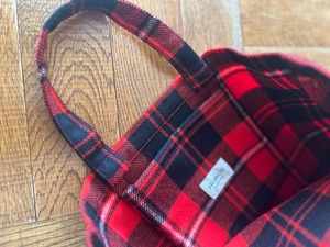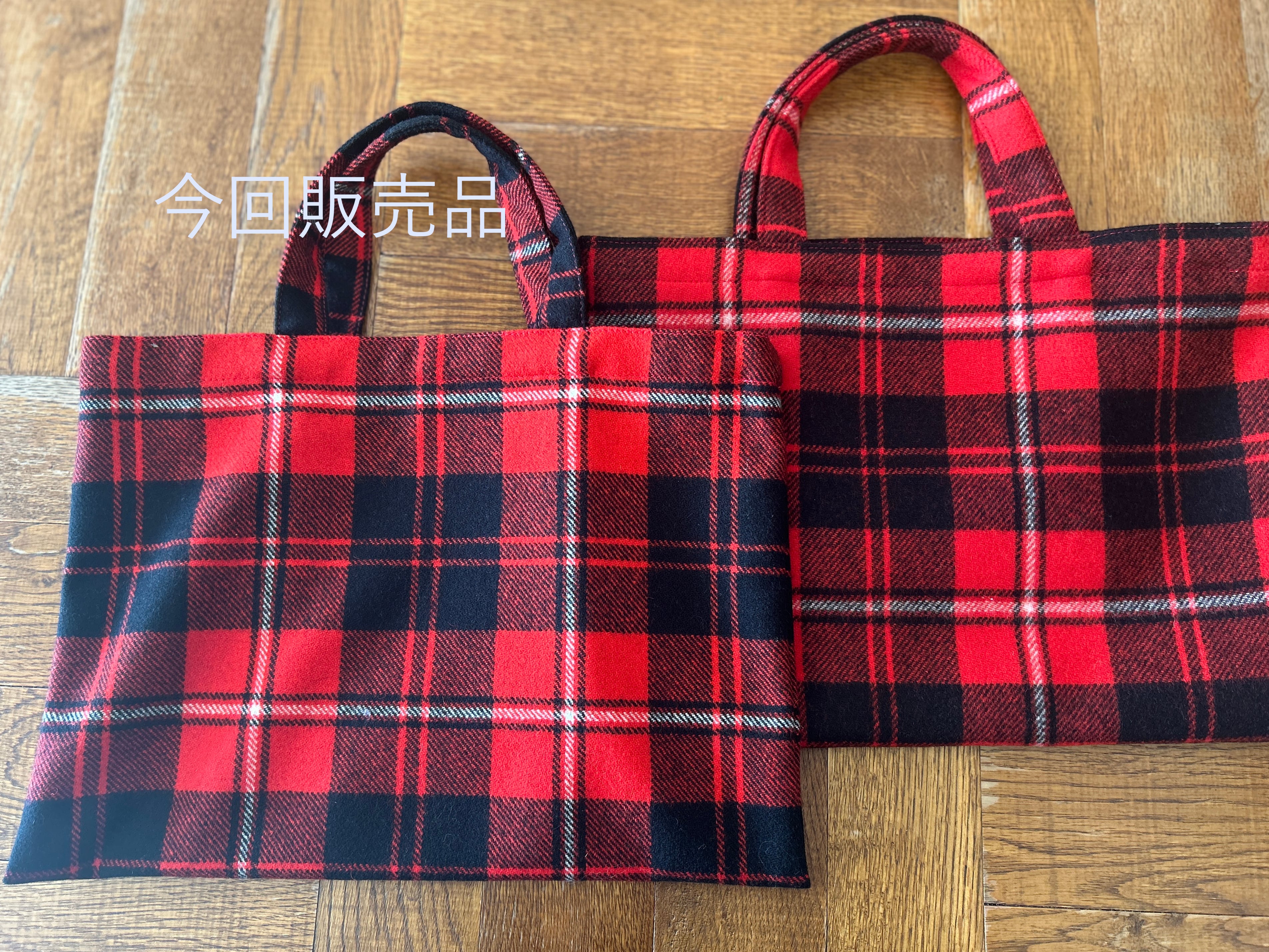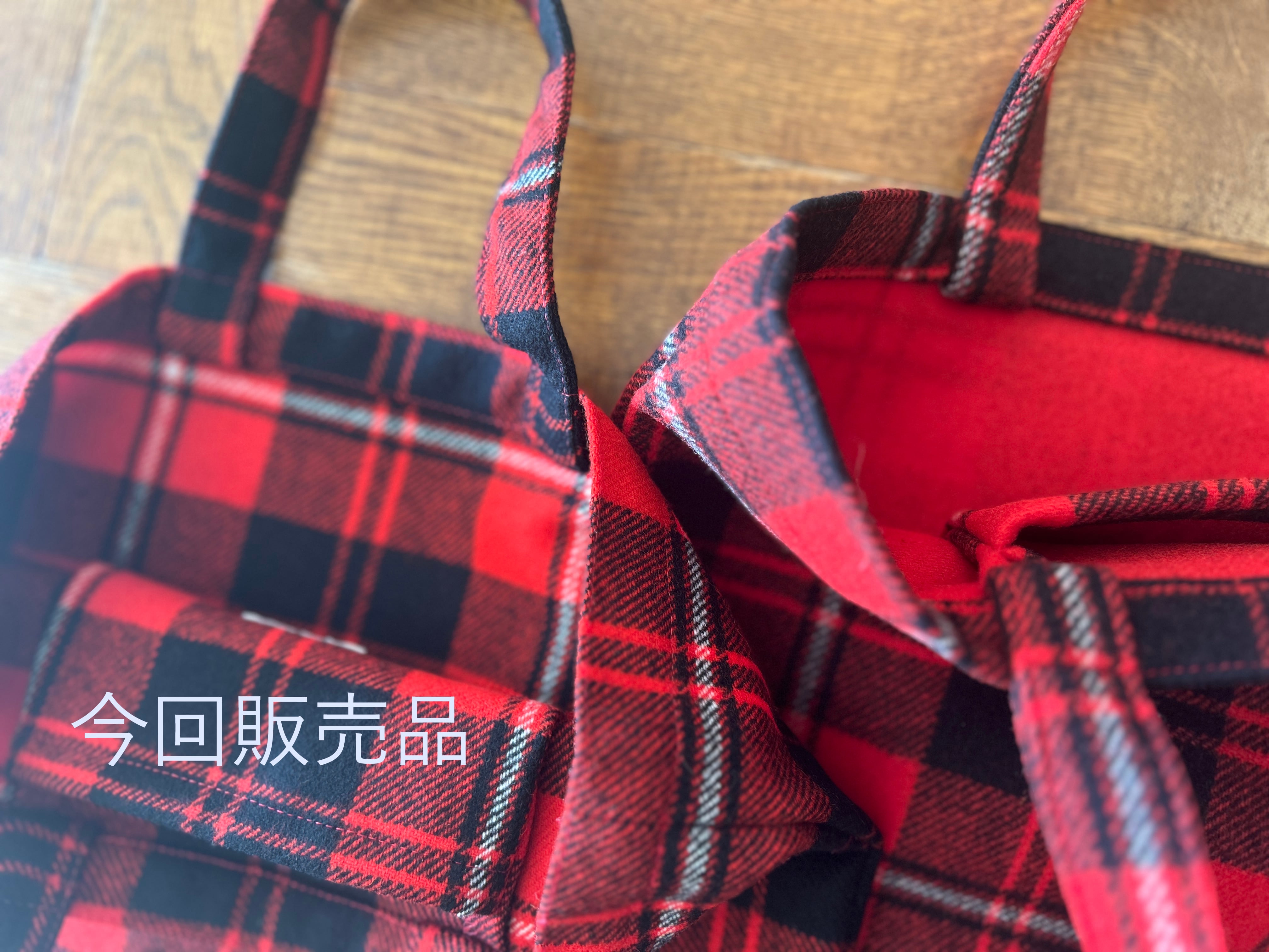 赤チェックバッグは生地によってチェックの赤や黒の分量が異なりますので写真のものと全く同じものではないことをご留意ください。お問い合わせが多くいただきありがとうございます。ほんの少しですが、オンラインに出しました。