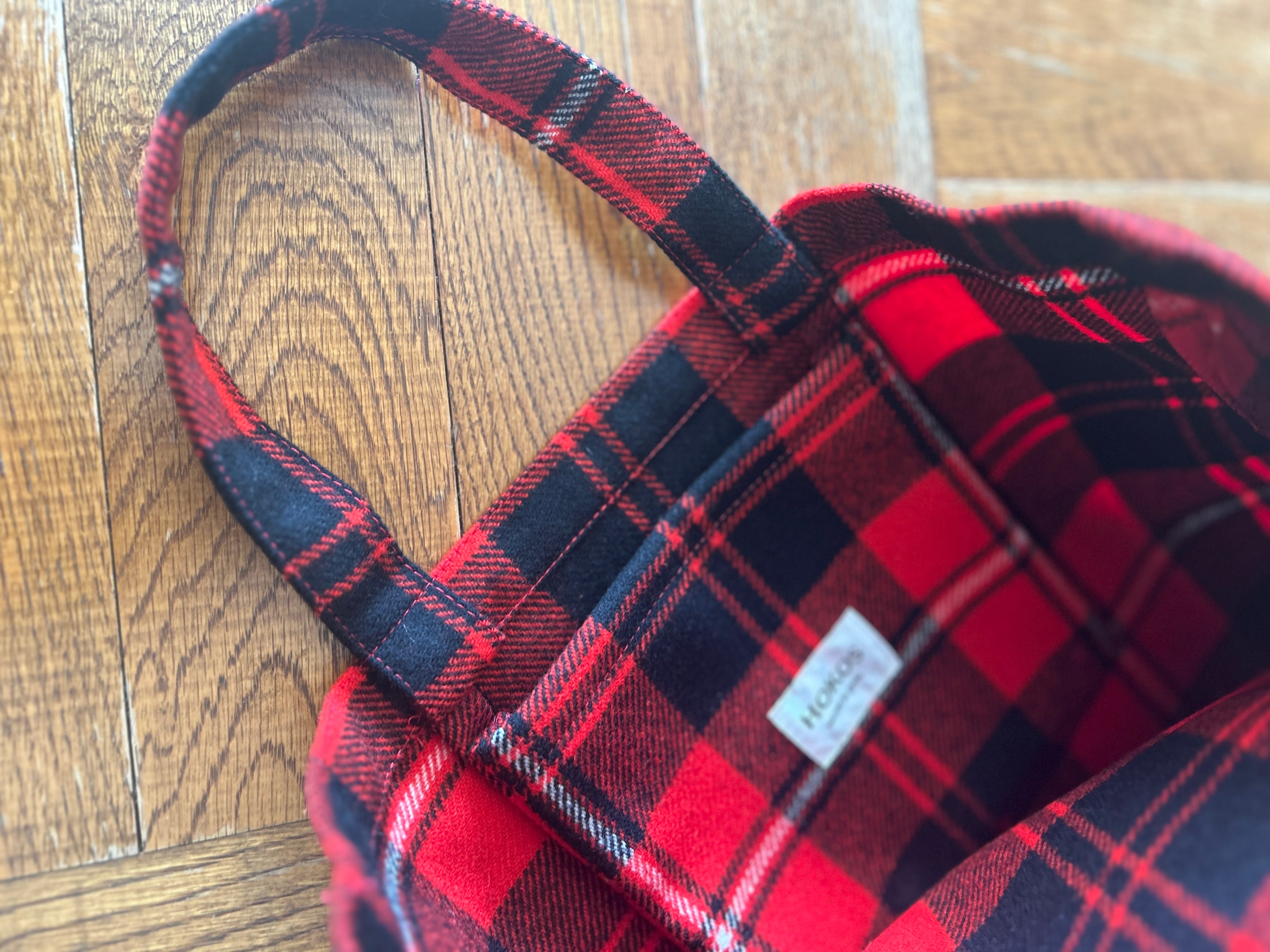 冬の差し色としてぴったりなウールのバッグを作りました。大人気のこちら(https://www.hokos.jp/items/124029352)の厚手のバッグを作る前に少しだけ販売していた二重ではない一重のウールバッグです。今回販売分は、裏地がなく現在SOLDOUT の人気商品と比べると赤い裏地がついておらずウール赤チェックのみの生地ですが、薄すぎるということはなくメインバッグとしても1枚で決まるアイテムです。モノトーンスタイルにも合う本当にいさぎよく可愛いバッグです。シンプルがゆえチャームなどをつけて楽しんでも◎
