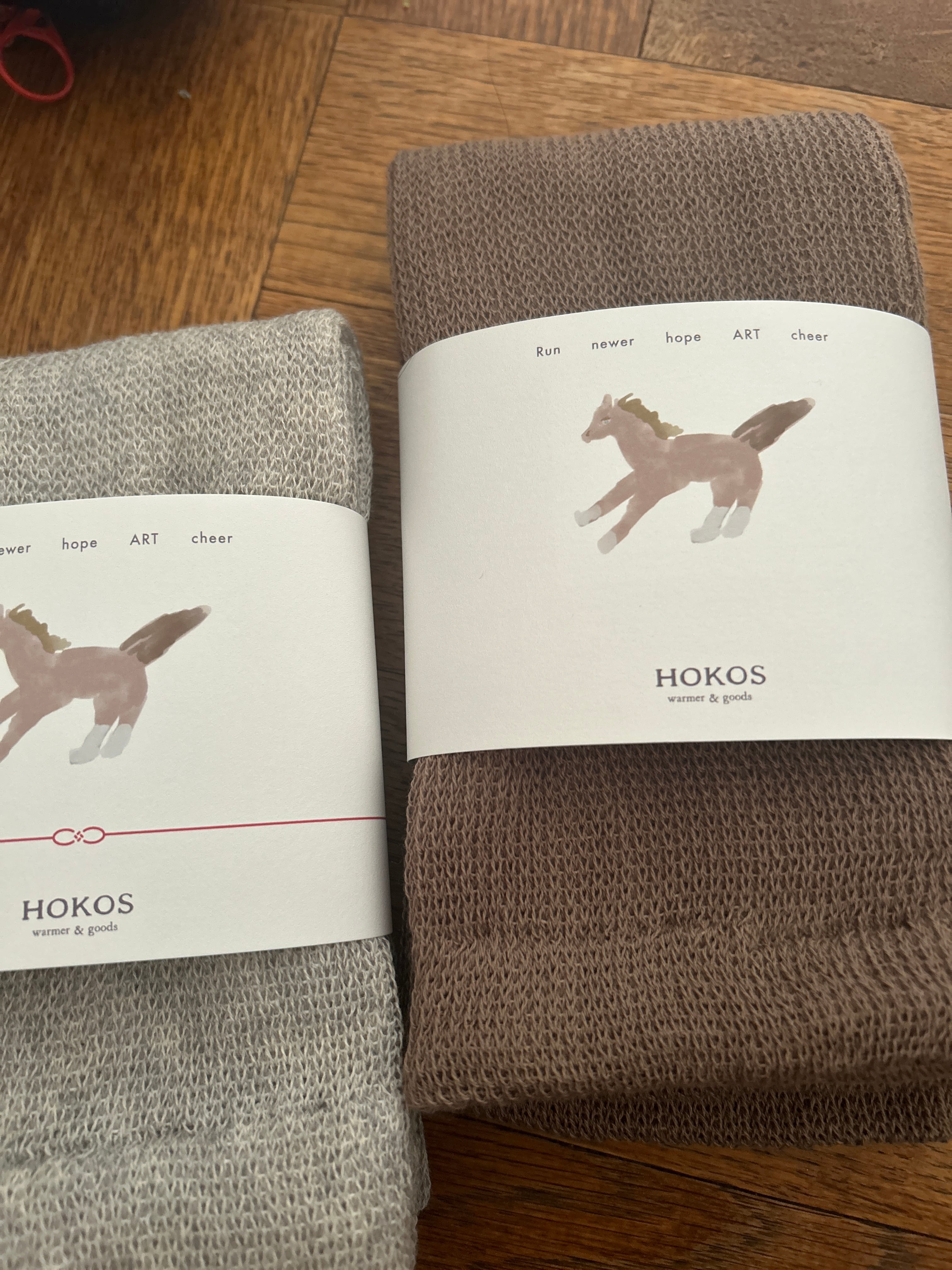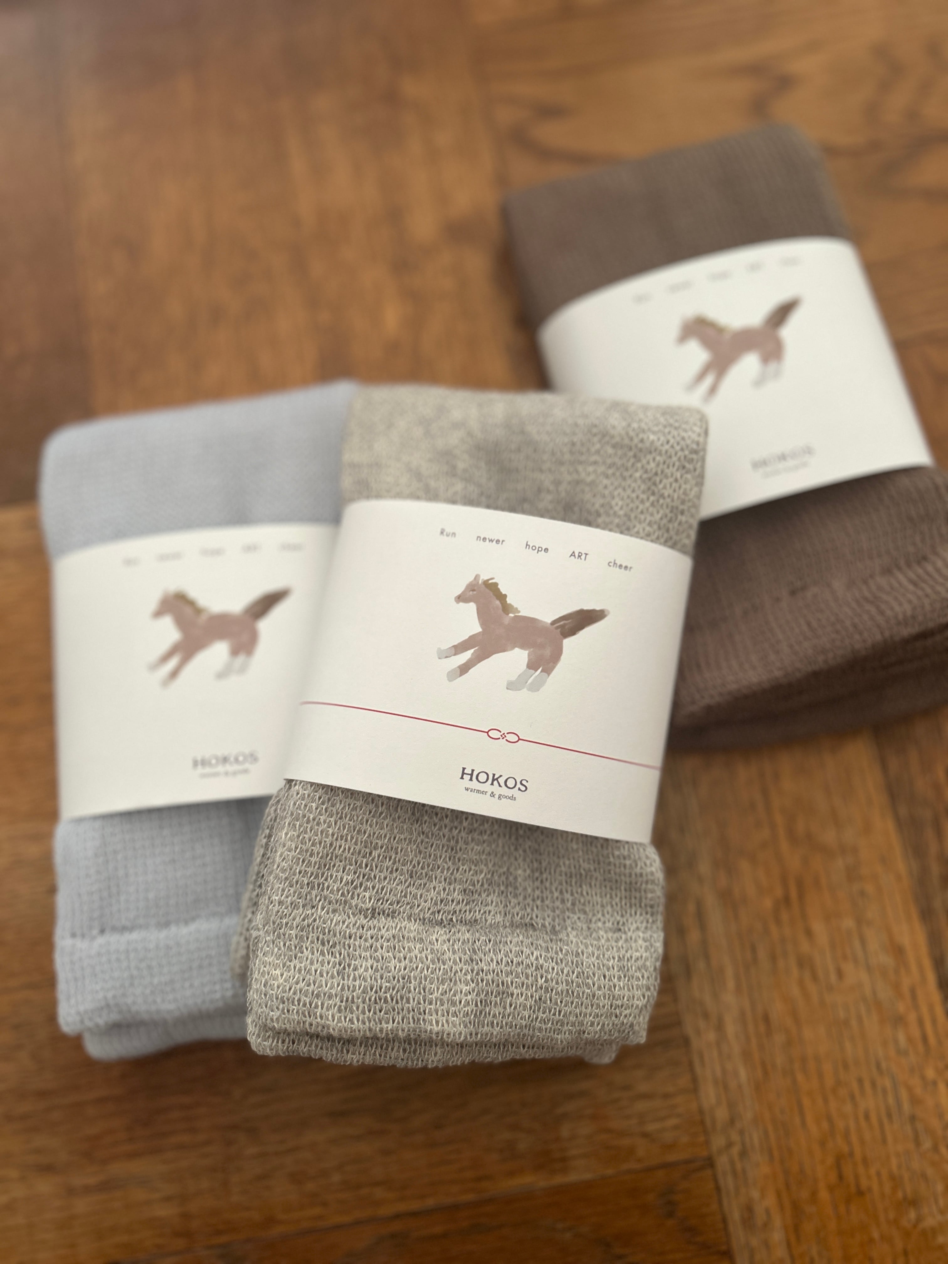 ソックスを履いている馬が描かれたアンクルウォーマーです。